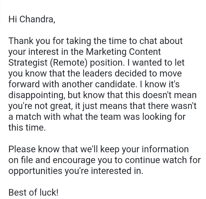 At any rate, with those interviews done, I figured I could cool my jets and take off my stressy-pants for at least a day or two —but most likely the better part of a week — because based on what I’d gleaned from BOTH organizations, I wouldn’t be hearing anything for a minute. I’d been told before leaving the interview at the second organization that they’d be interviewing one more candidate the day after me (they’d already met with one the day before), then they’d meet for a team debrief the day after THAT, and then there might be another round or some sort of project to complete. And the BH job had already established a pattern of getting back in touch with me about a week after each interview round.